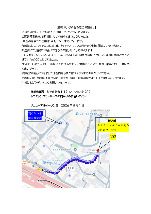 和光市新倉のあかつき鍼灸整骨院は、2011年2月に開院しました。和光市駅より徒歩で約2分のアクセスのよい場所にあります。「あかつき鍼灸整骨院」の青い看板が目印の、ビル1階です。営業時間は9:00~21:00で、20:30まで受け付けていることから仕事帰りの方にも立ち寄りやすくなっています。施術ジャンルは、訪問リハビリマッサージ、訪問はりきゅう、接骨・柔道整復、はり、きゅう、あん摩マッサージ指圧で、むくみの緩和が期待できるオイルマッサージ、美容はり、カッピングも行っています。施術スペースは完全個室ですので、他の人の目を気にすることなくリラックスしたプライベート空間で施術を受けることができます。四十肩や五十肩などの肩こり、骨盤矯正、頸部の痛みやしびれなどには、はり・きゅう・マッサージの中から適した施術方法を提案し、お客様の希望を取り入れながら施術されています。痛みがおさまった後もマッサージの要らない身体作りを目指して、自宅でできるトレーニング法をアドバイスされています。柔道整復師、あん摩マッサージ指圧師、はり師、きゅう師の国家資格を有して施術を行っておりますので、お困りの方は一度お気軽に相談してください。
